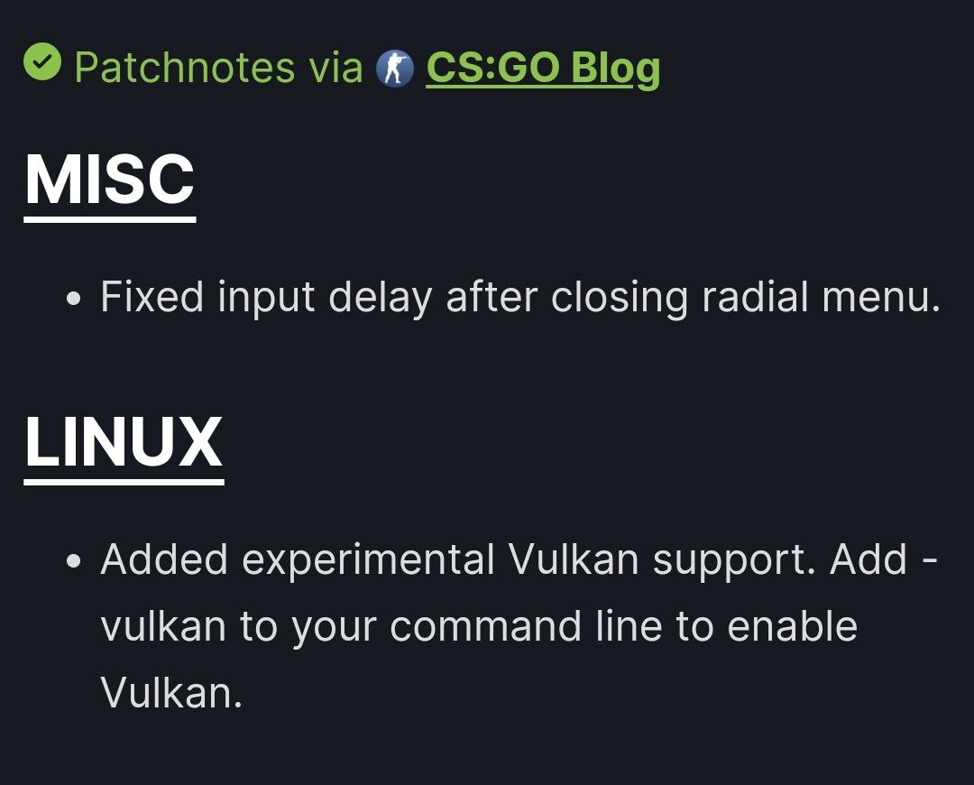 Также в недавнем обновлении разработчики Vulkan в CS:GO, но сделали это только для пользователей Linux. Vulkan — кроссплатформенный API для 2D- и 3D-графики. Это альтернатива существующим DirectX и OpenGL.