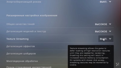 Если шутер установлен на SSD карту, то данные настройки вам не помогут, так как ничего не изменится. Если CS:GO находится на жестком диске, при включенном стриминге возможна потеря FPS, причиной чего является медленная прогрузка текстур. Поэтому его рекомендуется выключить.